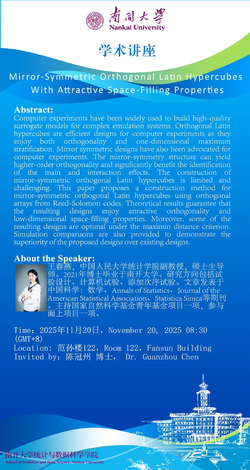 Mirror-Symmetric Orthogonal Latin Hypercubes With Attractive Space-Filling Properties(王春燕)